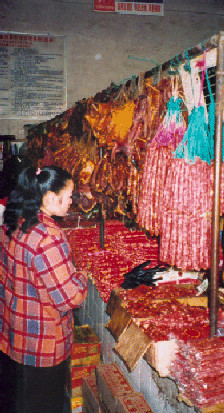 Fantastischer Räucherwaren- Stand auf einem Markt in Gulin. Was so vertraut aussieht, kann auch nach Zimt und Zucker schmecken.