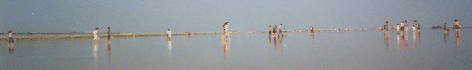 Ca. 30 Fahrminuten von Shanghai genießen Tausende die Stimmung bei Ebbe über Kilometer spiegelnden Sandboden zu wandern. Am Ufer findet sich jedoch statt Strand ein denkbar hässlicher Betondeich. |