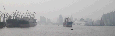In Shanghais Hafen drängen sich nur wenige Minuten vom Stadtzentrum entfernt die Hochsee-Frachter. Im Hintergrund liegt vor dem Ocean-Hotel ein großes britisches Kreuzfahrtschiff. |
