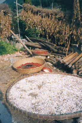 Pepperoni und Kürbis ausgebreitet zum Trocknen - Anhui ist eine der armen bäuerlichen Provinzen, in denen große Teile des taeglichen Lebens in einfachsten Bahnen laufen. |