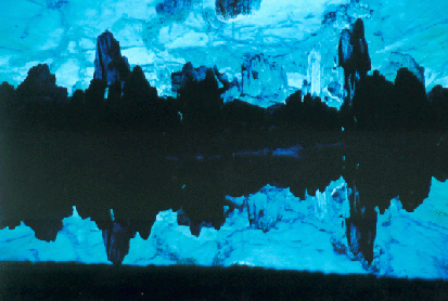Wie der Blick in ene andere Welt: Spiegelungen im größten Dom der teilweise überwältigenden Red (reed?) Flute Cave nahe Guilin. |