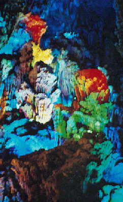 Mit farbigem Licht werden die meterhohen Tropfsteinformationen der Red-Flute-Cave zur Wunderwelt.Obwohl wir keine Höhlenfans sind hat diese bleibenden Eindruck hinterlassen. |
