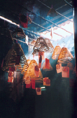 Stimmung im A-Mah geweihten Gründungstempel von Macao. Mit dem Rauch steigen die in die fast meterhohen Räucher-Spiralen gehängten Gebete auf. |