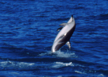 Ein Dusky Dolphin macht seinem Ruf als Artist alle Ehre. Das Schwimmen mit wilden Delfinen entwickelte sich in aller