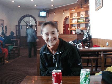 In der Skihütte an der Bergstation, statt Kaiserschmarrn gibt’s Jiaozi, aber wie man sieht kann man es bestens aushalten. |