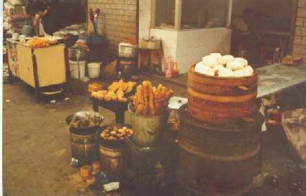 Einfache Garküche mit Tee-Eiern, Klebreis in Palmwickeln, fettgebackenen Broten und Hefeklößen auf unserem Markt
