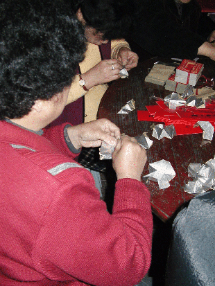 Frauen falten symbolische Opfergaben (gefaltet werden u.a. alle Arten von Wertgegenständen, sogar Häuser) für eine taoistische Trauerzeremonie. Die Gaben werden verbrannt und so zu den Toten geschickt. |