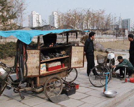 Typisches, fahrbares Kleingewerbe, hier eine Fahrradwerkstadt am Straßenrand in einem aus neu und alt gemischten Wohnbezirk.. |
