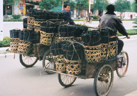 Lastenradfahrer sind das Rückrat des Privattransportes - hier zwei sichtlich entspannte Vertreter der Zunft bei der Ausfahrt von Holzkohle in Guilin. |