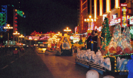 Obwohl Nebensaison zug jeden Abend diese Disney-World-artige Parade durch die blinkende Hauptstraße von Guilin, an der sich neben Leuchtreklamen so viele ebenso schöne wie spottbillige Snackstände fanden, das wir trotz Eiseskälte nicht umhin kamen, einmal abends im Freien zu speisen. |